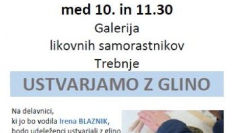 V sodelovanju z JSKD OI Trebnje otroke v soboto, 4. februarja 2017, ob 10. uri vabimo na delavnico Sobotno galerijsko dopoldne: Ustvarjamo z glino. Na delavnici, ki jo bo vodila Irena BLAZNIK, bodo udeleženci ustvarjali z glino. Kotizacija: 3€ Plačilo ob prihodu na delavnico. Vsi materiali so zagotovljeni. Prijave so OBVEZNE in jih sprejemamo do