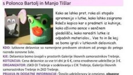 V sodelovanju z JSKD OI Trebnje vas vabimo na delavnico Lutkovne poslastice za lutkoljubce s Polonco Bartolj in Manjo Tišlar. Pričetek: ponedeljek, 20. februar 2017, ob 15. uri. Kako se lahko prst, roka ali stopalo spremenijo v lutke, kako lahko zaigramo Rdečo kapico kar s predmeti iz kuhinje, kako oživimo sence v senčnem gledališču, kako