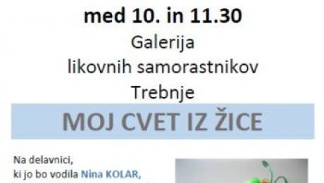 V sodelovanju z JSKD OI Trebnje otroke v soboto, 4. marca 2017, ob 10. uri vabimo na delavnico Sobotno galerijsko dopoldne: Moj cvet iz žice. Na delavnici, ki jo bo vodila Nina KOLAR, bodo udeleženci ustvarjali z žico. Kotizacija: 3€ Plačilo ob prihodu na delavnico. Vsi materiali so zagotovljeni. Prijave so OBVEZNE in jih sprejemamo