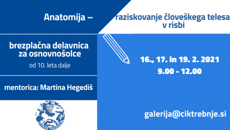 Delavnica Anatomija – raziskovanje človeškega telesa v risbi Osnovnošolce, starejše od 10. let, vabimo na brezplačne počitniške delavnice, ki bodo potekale 16. 2., 17. 2. in 19. 2. 2021, od 9.00 do 12.00. Mentorica na delavnici bo Martina Hegediš. Delavnica je namenjena osnovnošolskim otrokom, ki v učnem procesu izkazujejo zanimanje za človeško figuro in domače