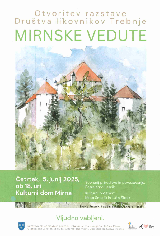 Odprtje razstave Mirnske vedute bo v Kulturnem domu Mirna, v četrtek, 5. junija 2025, ob 18. uri. Slavnostno jo bo odprl župan Občine Mirna, Dušan Skerbiš.