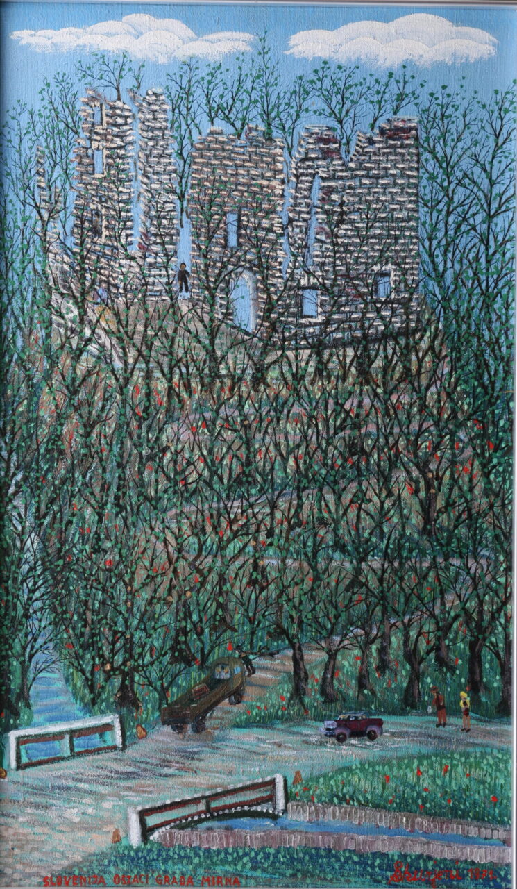 Posebno pozornost si zasluži tudi umetnina iz zbirke Galerije likovnih samorastnikov Trebnje, ki bo dopolnila razstavo: Matija Skurjeni, Mirnski grad, olje na platno, 1971.